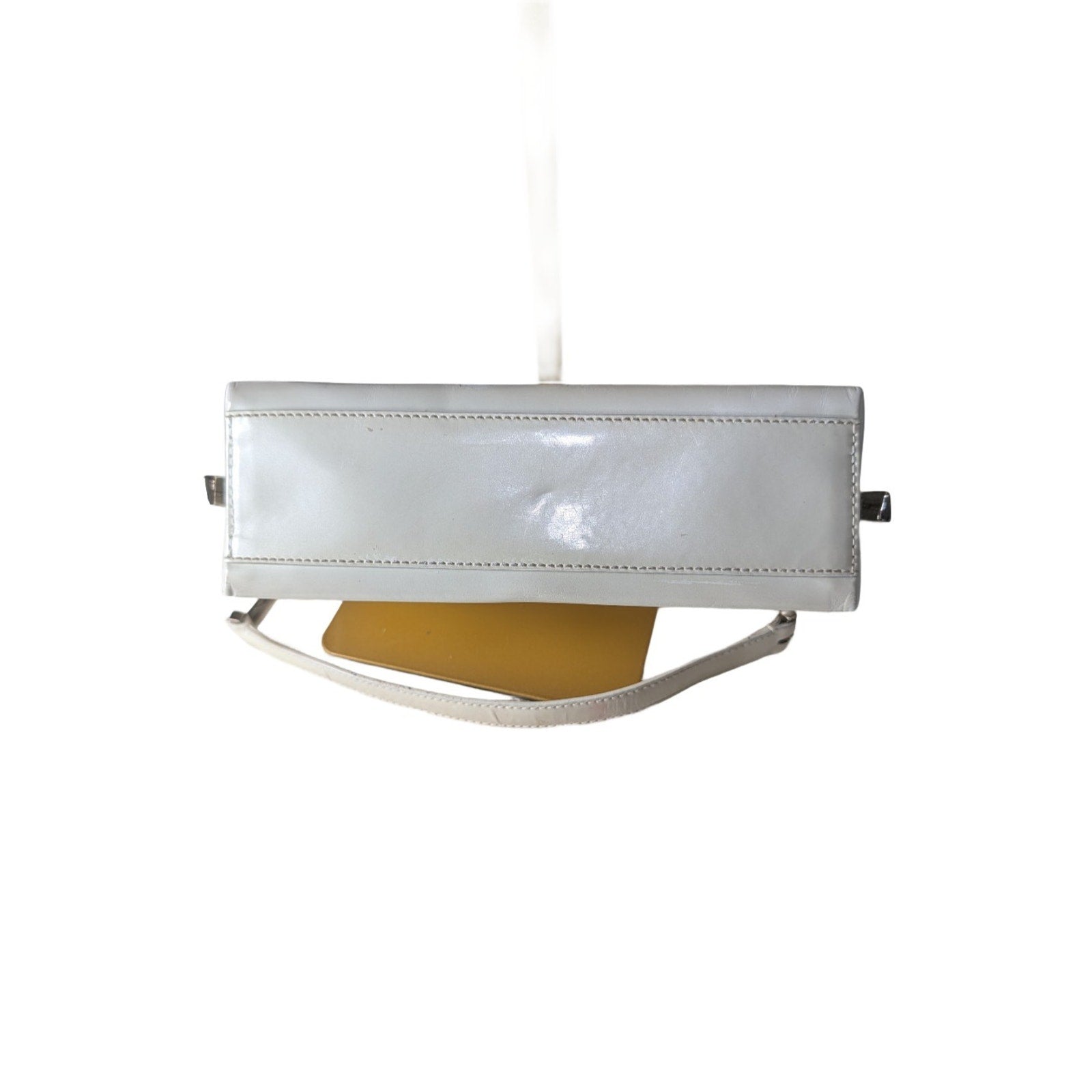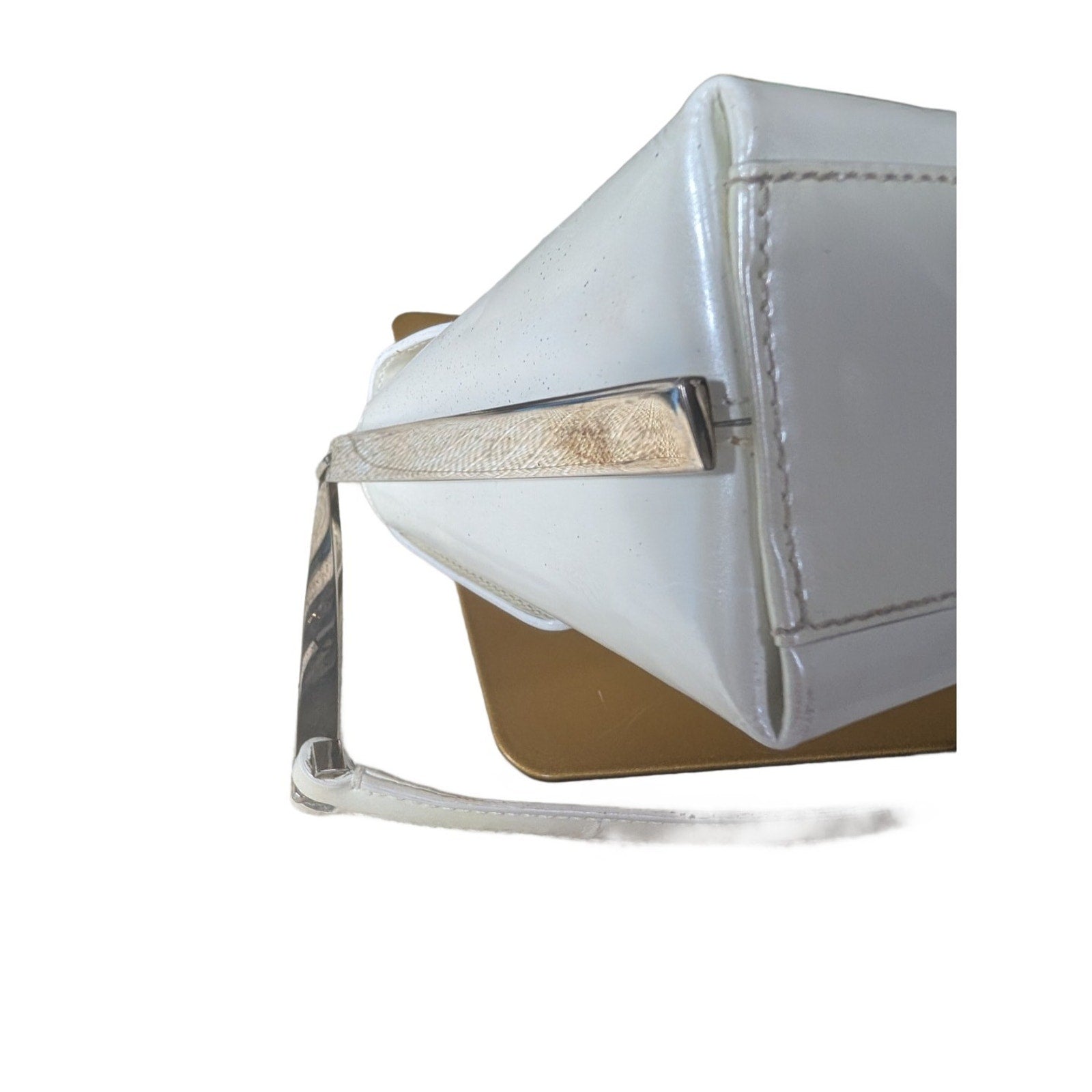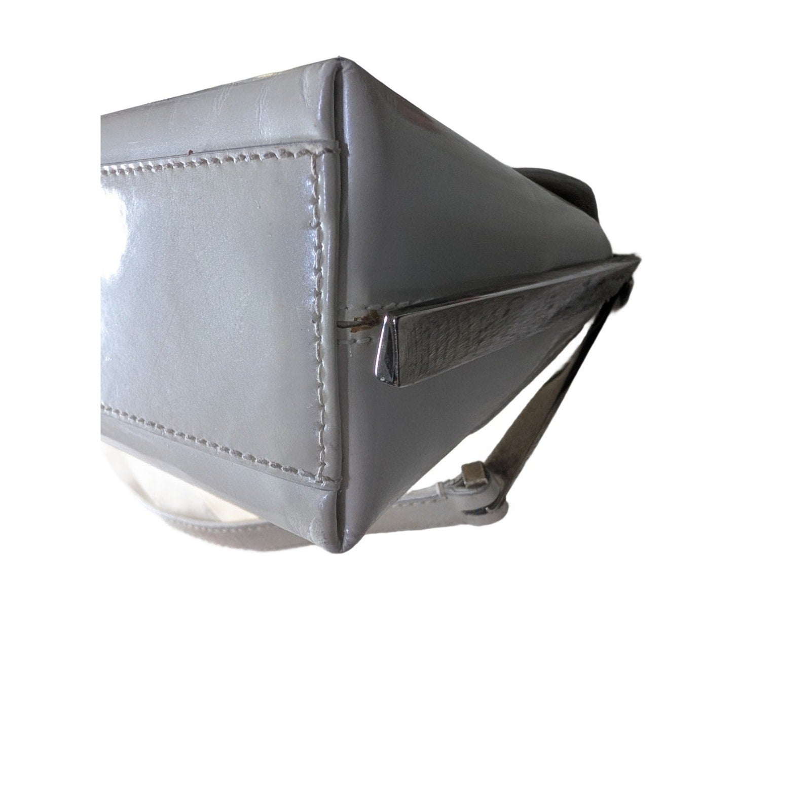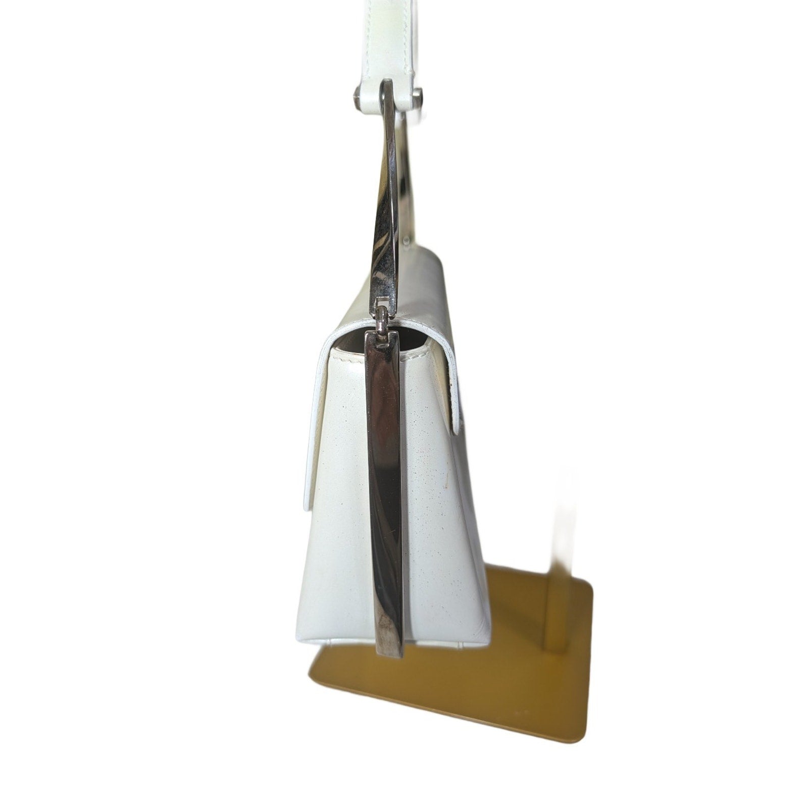 The VTG Salvatore Ferragamo Pearl Patent Leather Evening Bag with Silver Gancini Accents is a stylish and elegant top handle bag perfect for formal occasions like weddings, parties, or cocktails.