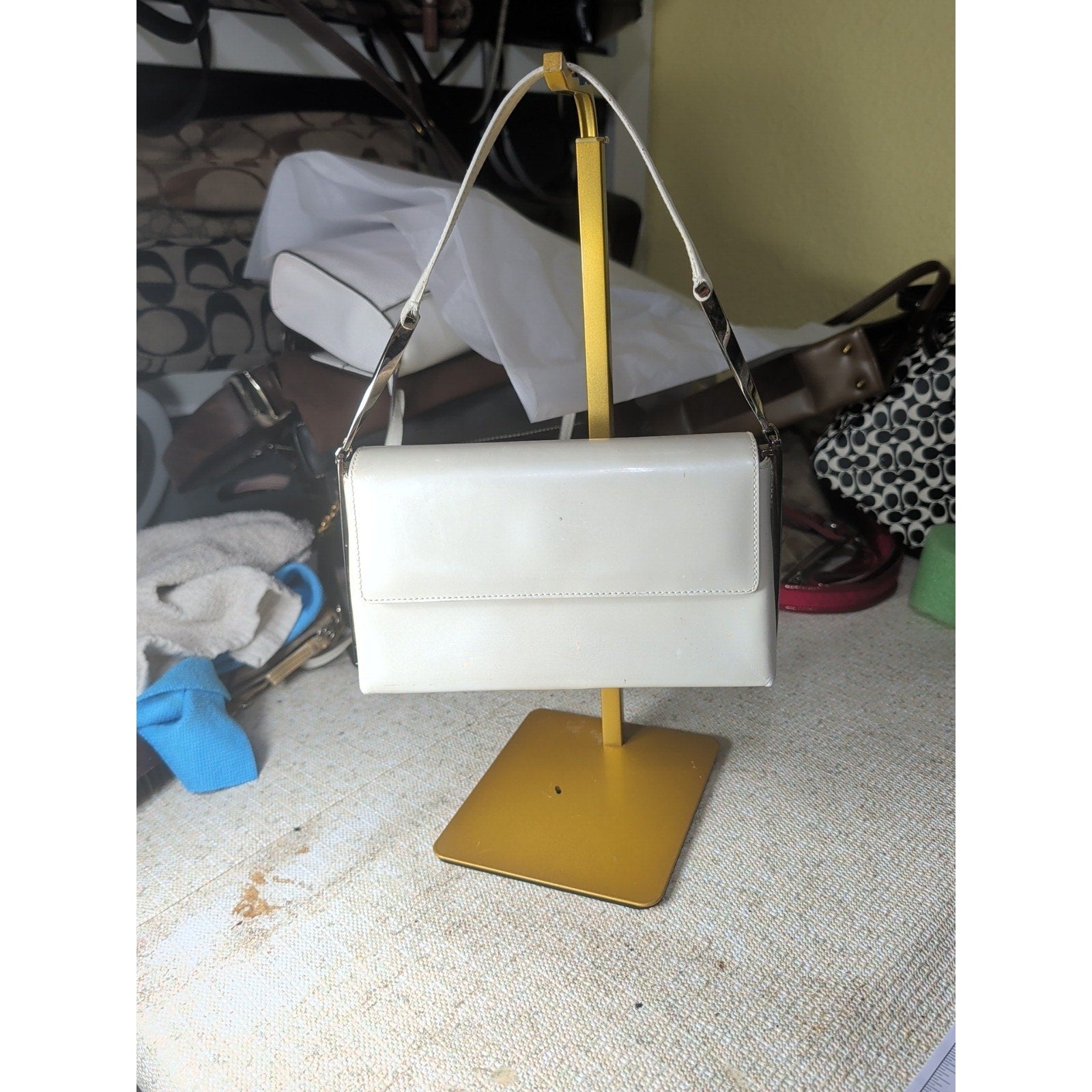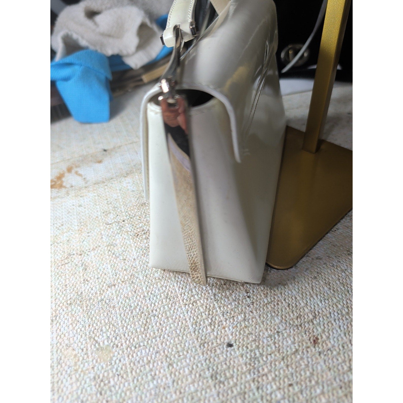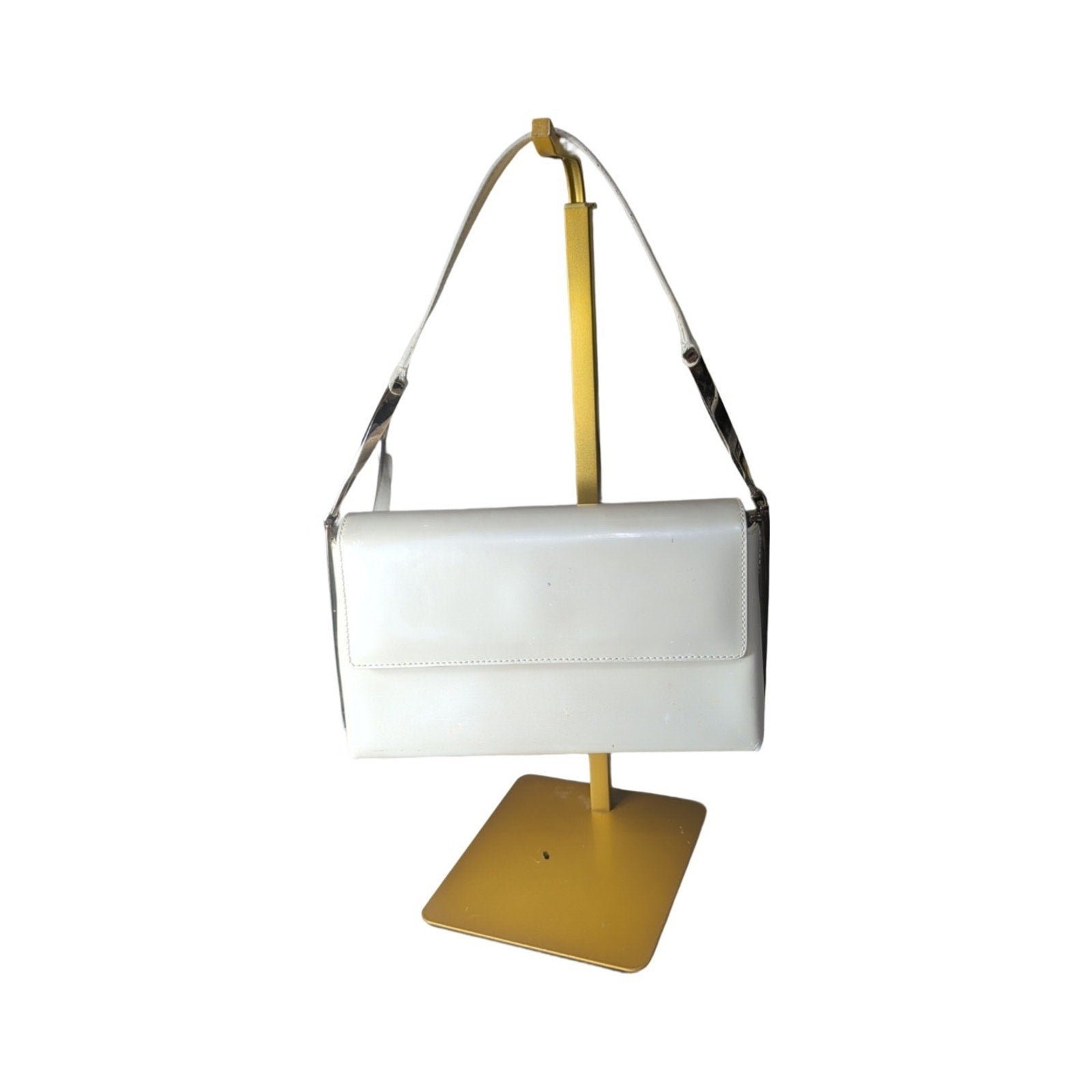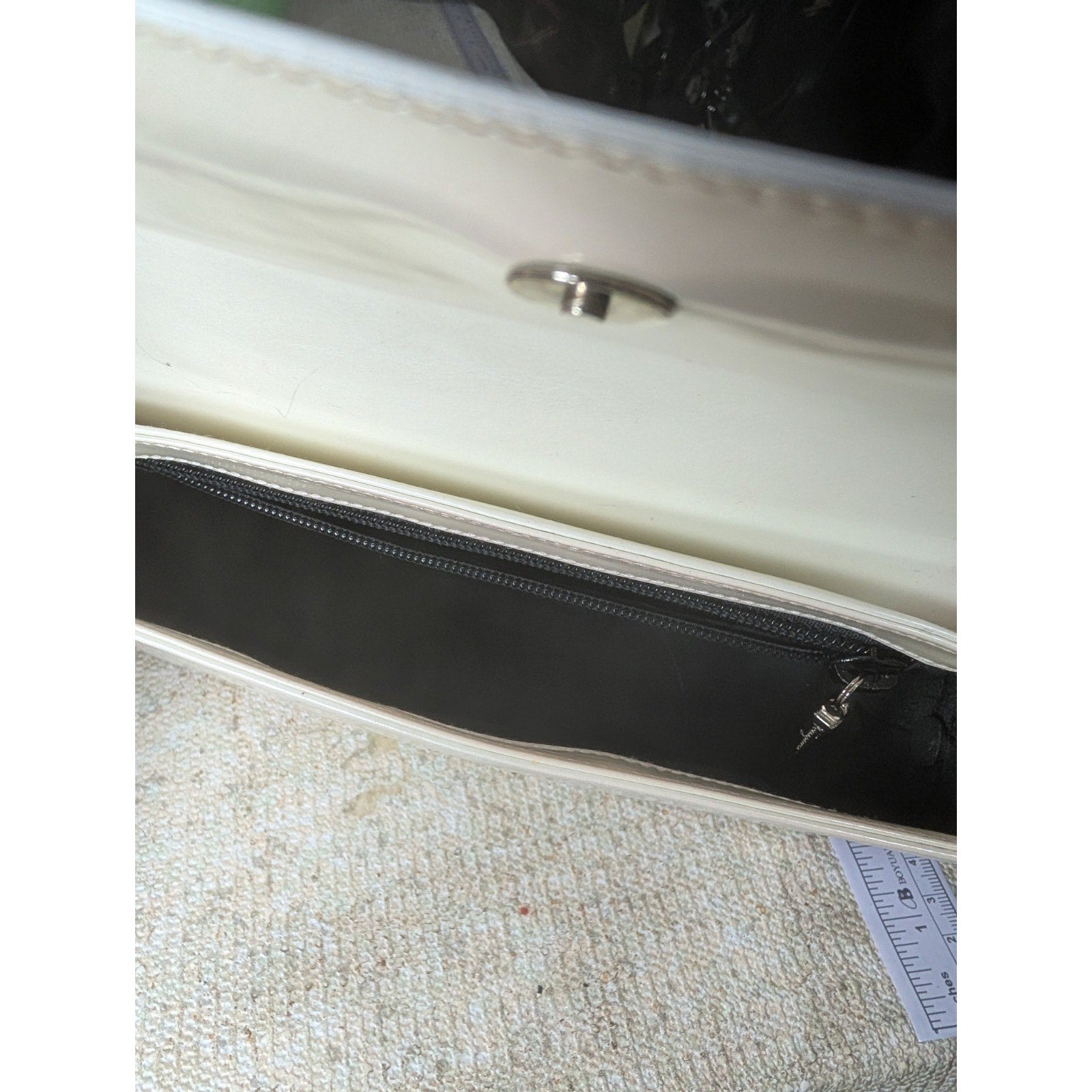 The VTG Salvatore Ferragamo Pearl Patent Leather Evening Bag with Silver Gancini Accents is a stylish and elegant top handle bag perfect for formal occasions like weddings, parties, or cocktails.